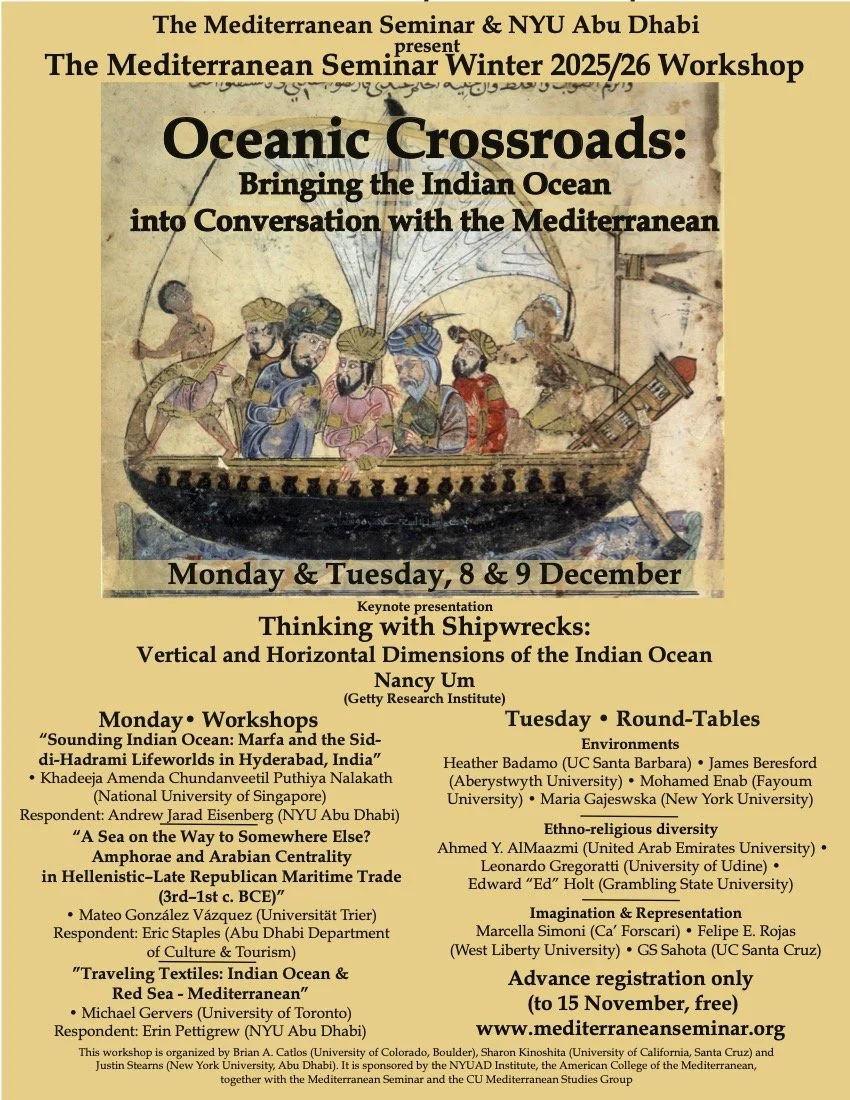 #Monday and Tuesday 8 & 9 December - The Mediterranean Seminar Winter 2025/26 Workshop “Oceanic Crossroads” will be held on the campus of NYU Abu Dhabi, on Monday and Tuesday 8 & 9 December, featuring keynote speaker Nancy Um (Getty). For program and to register, see here