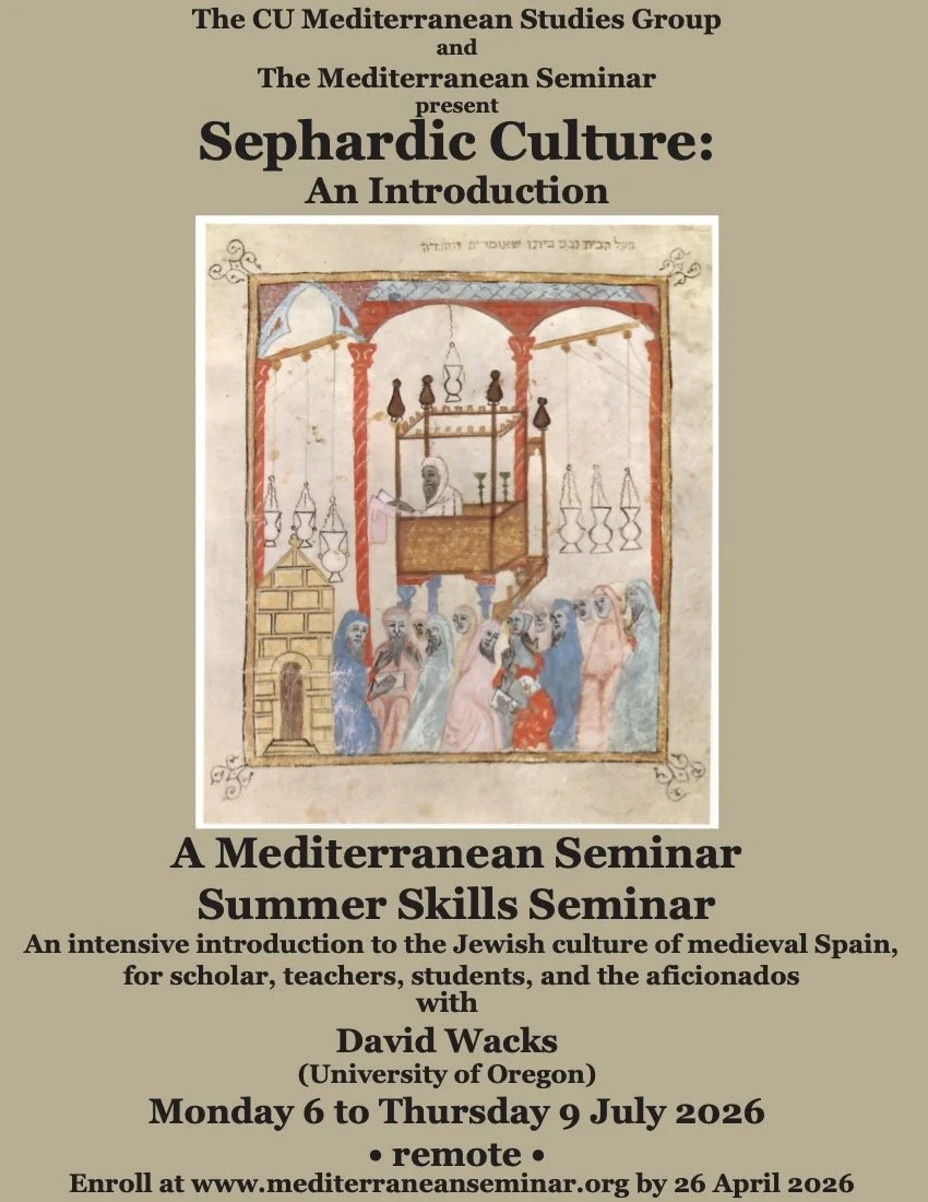The Summer Skills Seminar, “Sephardic Culture: An Introduction” will convene via Zoom from Monday, 6 July to Thursday, 9 July 2026 each day for 2 hours (8-10 PST), break for 1 hour (10-11 PST), and reconvene for 2 hours (11-1 PST).