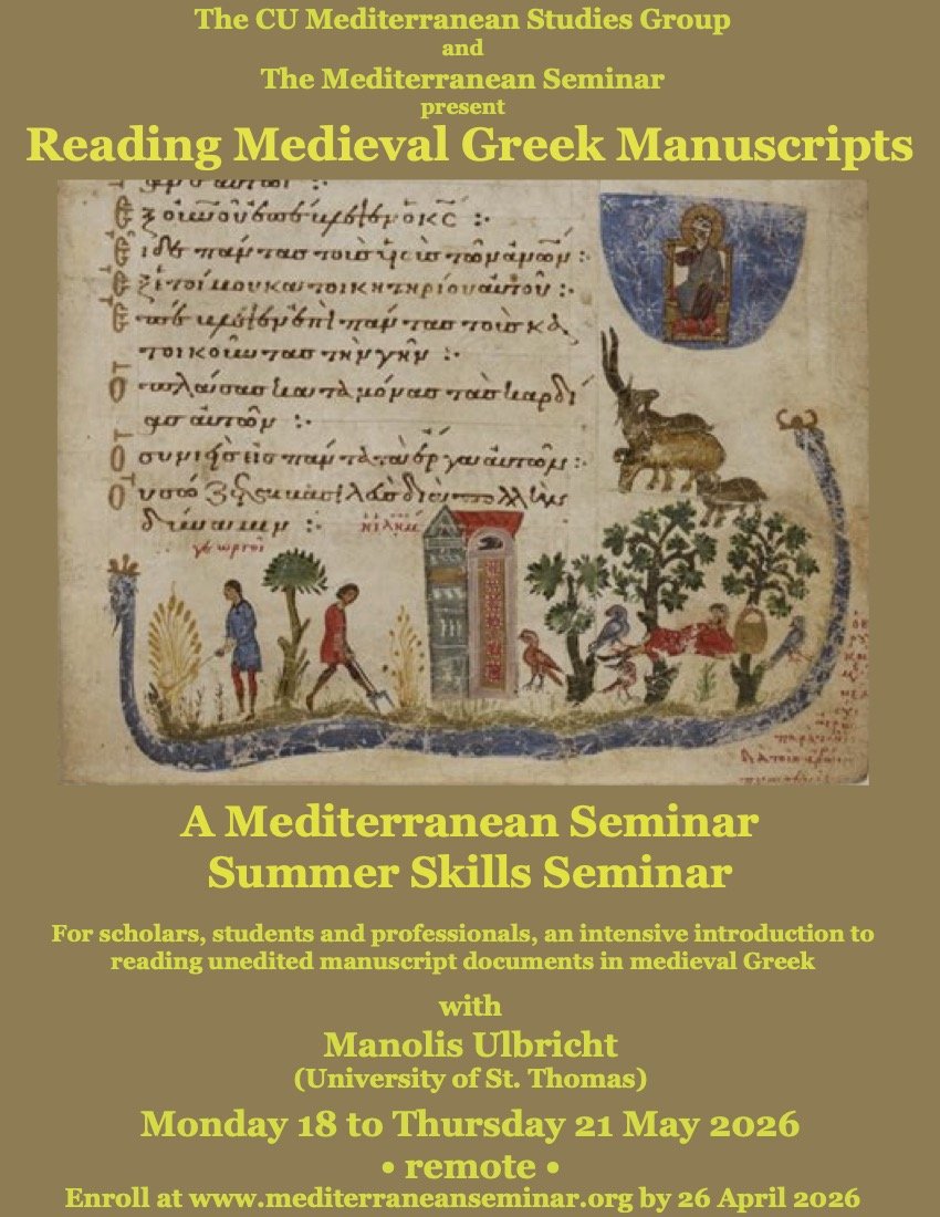 The Summer Skills Seminar, “Reading Medieval Greek Manuscripts” will be held via Zoom from Monday, 18 May to Thursday, 21 May 2026 from 10am to noon and 1pm to 3pm MDT.